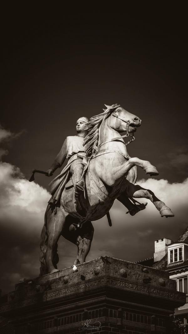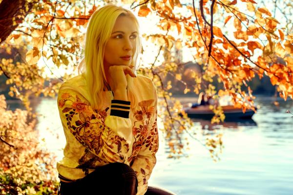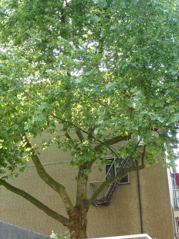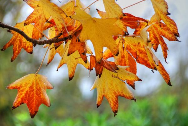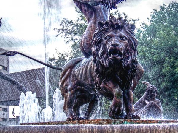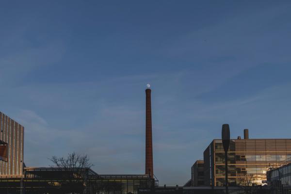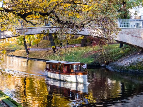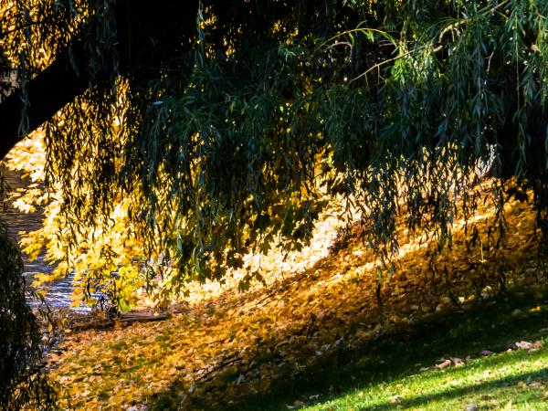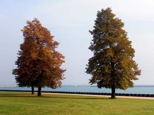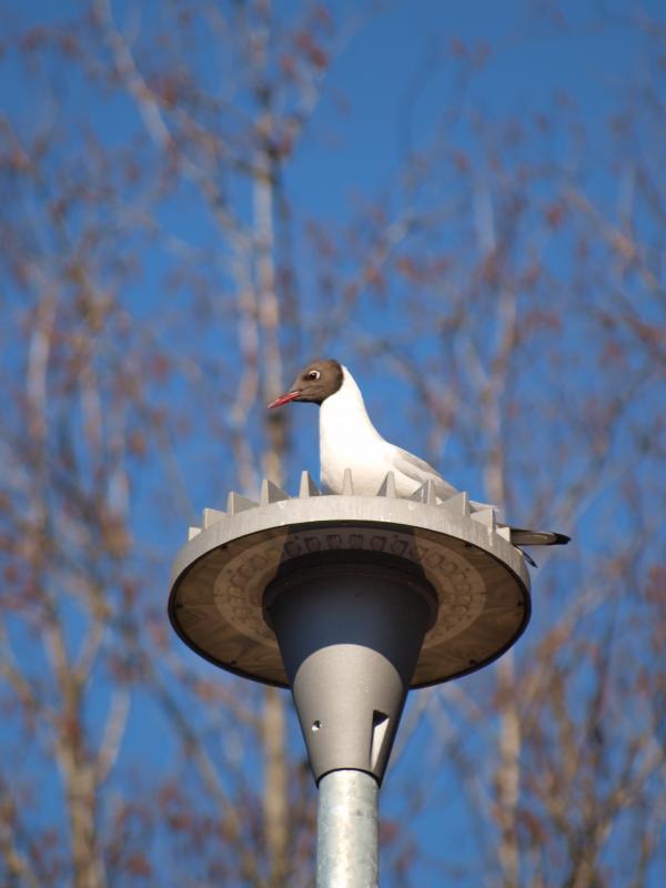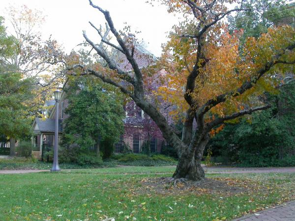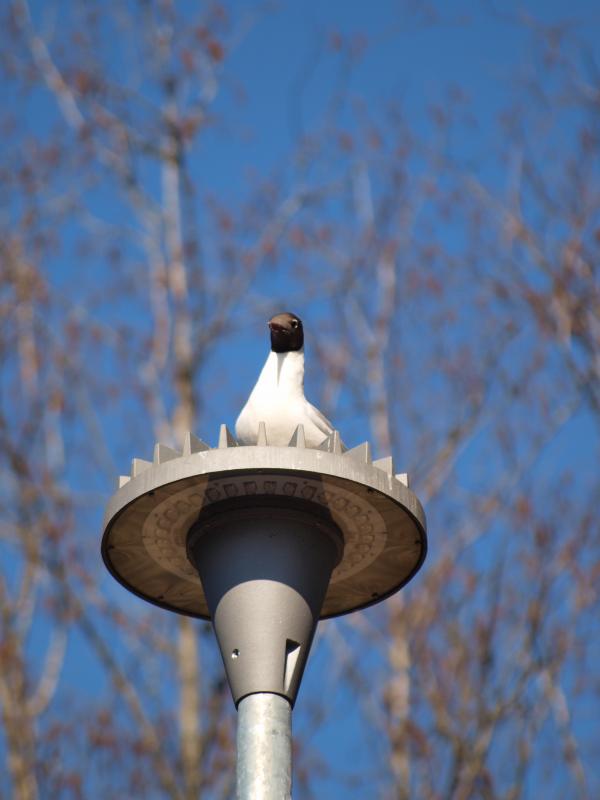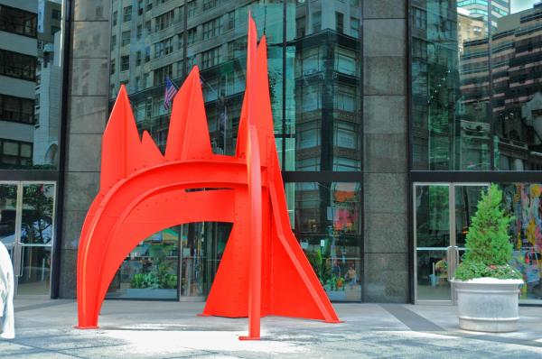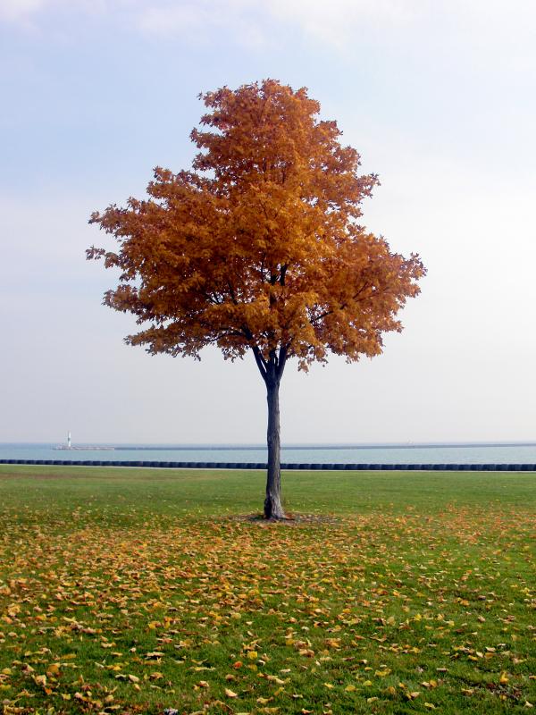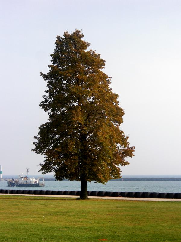sculpture in the street with a autumn tree, in the city Amsterdam, Netherlands.